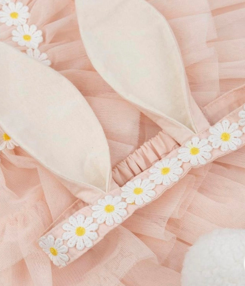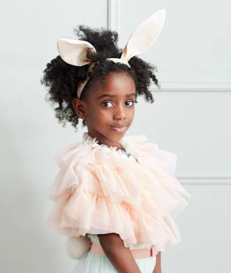 This beautiful bunny costume is crafted from a premium fabric and embroidered details. Perfect for dress up, as a costume, or for an Easter celebration. Comes with a headband with 3D ears, a romantic layered tulle cape, and a velvet waistband with a soft pompom tail.