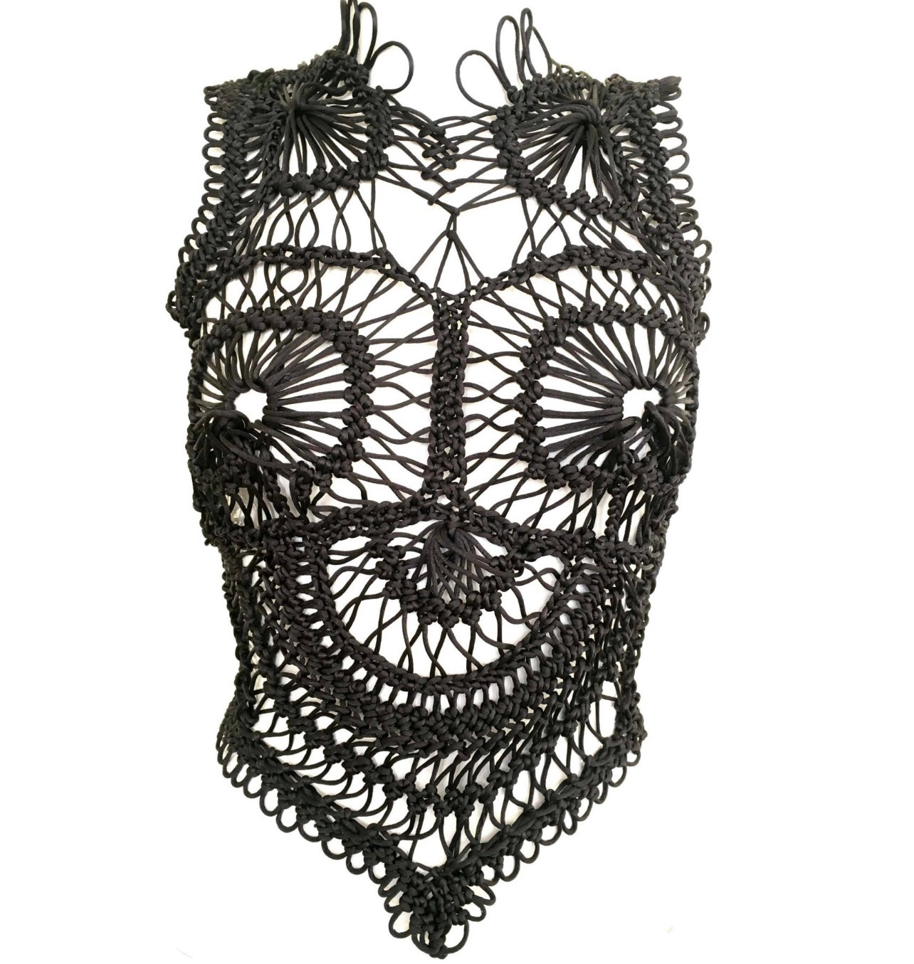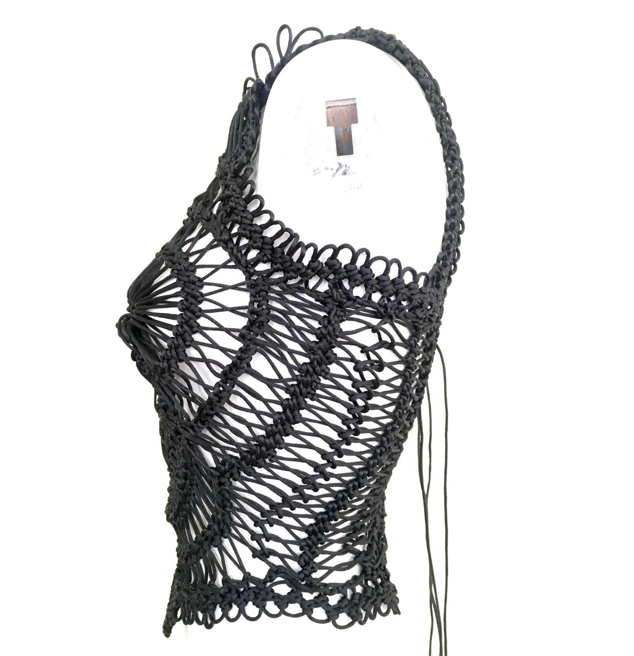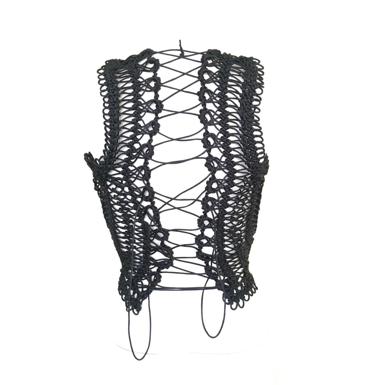 A sleeveless hand-crocheted tank top with intricate knit detailing and adjustable back tie.